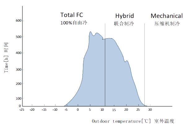 天加風冷自由冷冷水機組可以利用自然界低溫空氣進行冷卻,隨著環(huán)境溫度的降低,自由冷卻的比例越來越大,機組的功耗越來越低,直至100%自由冷卻,僅有少量風扇功耗,從而大幅降低機組用電量。